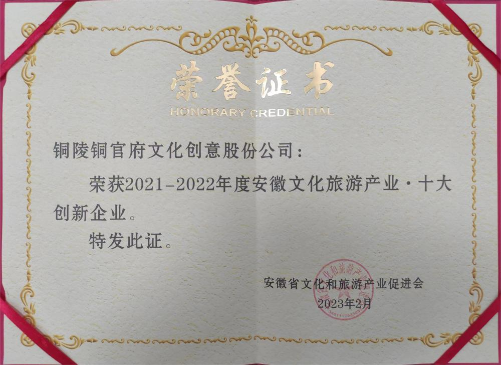 日前,由安徽省文化和旅游產(chǎn)業(yè)促進會(省文促會)主辦的第二屆安徽文化旅游產(chǎn)業(yè)2021-2022年度頒獎盛典暨新春聯(lián)誼會活動在合肥舉行,2021-2022 年度“七個十”榜單公布。銅陵銅官府文化創(chuàng)意股份公司榮獲“2021-2022年度安徽文化旅游產(chǎn)業(yè) · 十大創(chuàng)新企業(yè)”,公司創(chuàng)始人趙敏榮獲“2021-2022年度安徽文化旅游產(chǎn)業(yè) · 十大榜樣人物”。