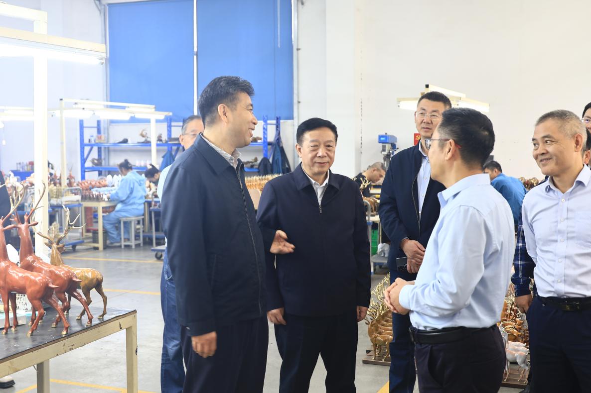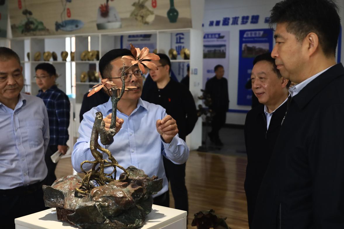 公司負(fù)責(zé)人郭飛陪同參觀并匯報(bào)了企業(yè)生產(chǎn)經(jīng)營(yíng)、市場(chǎng)銷售、非遺技藝傳承等情況。調(diào)研組深入車間詳細(xì)了解銅工藝品制作技藝、工藝傳承創(chuàng)新,曲福田副主任對(duì)我公司把傳統(tǒng)工藝和現(xiàn)代創(chuàng)意有機(jī)結(jié)合做法給予充分肯定,并就優(yōu)化產(chǎn)品結(jié)構(gòu)、提升產(chǎn)品競(jìng)爭(zhēng)力與公司負(fù)責(zé)人進(jìn)行交流探討,他希望銅官府進(jìn)一步強(qiáng)化品牌培育,用匠心延續(xù)銅工藝的“金”字招牌。
