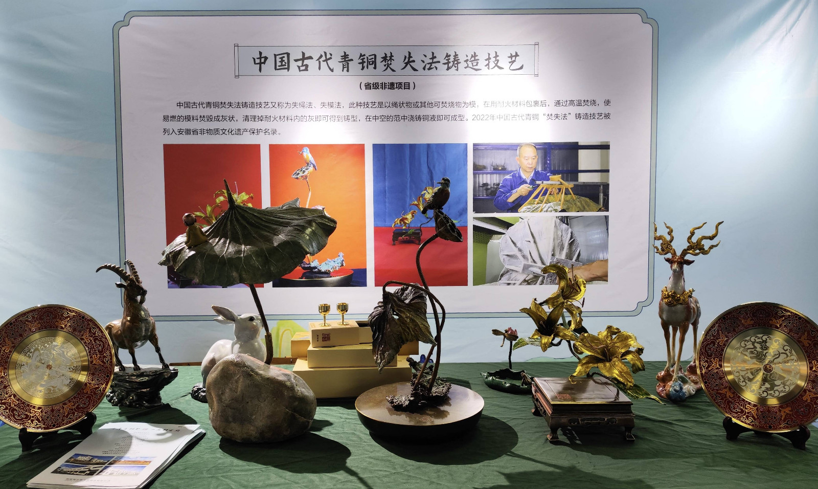 11月22日,以“皖風(fēng)徽韻·共享瑰寶”為主題的安徽省非物質(zhì)文化遺產(chǎn)傳統(tǒng)技藝大展在蚌埠市舉行。我公司的省級(jí)非遺項(xiàng)目——中國古代青銅焚失法鑄造技藝亮相大展?;顒?dòng)現(xiàn)場,銅陵文化館館長、銅陵市非物質(zhì)文化遺產(chǎn)保護(hù)中心主任陳建平向安徽省非遺保護(hù)中心主任宋磊、安徽省文化和旅游廳非遺處一級(jí)調(diào)研員彭正闊一行和現(xiàn)場觀眾詳細(xì)介紹了焚失法非遺技藝以及系列作品。焚失法鑄造技藝穿越千年,以其獨(dú)特的工藝和別具一格的藝術(shù)風(fēng)格完成了由實(shí)用技藝到藝術(shù)創(chuàng)作的轉(zhuǎn)型,展示了非遺傳承人的智慧,贏得了大家的一致好評(píng)。安徽老字號(hào)“銅官府”作為非遺傳承的重要力量,將繼續(xù)堅(jiān)持守正創(chuàng)新,為傳承發(fā)展非遺技藝和弘揚(yáng)傳統(tǒng)文化續(xù)寫新篇章。